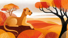 The Stylized Lioness Safari Mural Wallpaper is a bold and modern graphic artwork. The design features a serene lioness resting on a rock, set against a stylized African landscape composed of flat, overlapping shapes in vivid orange, terracotta, red, and yellow. The clean, flat color blocks and sharp silhouettes of the trees give the scene a geometric, contemporary feel, reminiscent of mid-century modern illustration. The warm, fiery color palette creates an immediate sense of heat and energy. This mural is ideal for a creative nursery, a modern children's room, or an interior space seeking a vibrant, artistic statement piece.