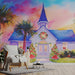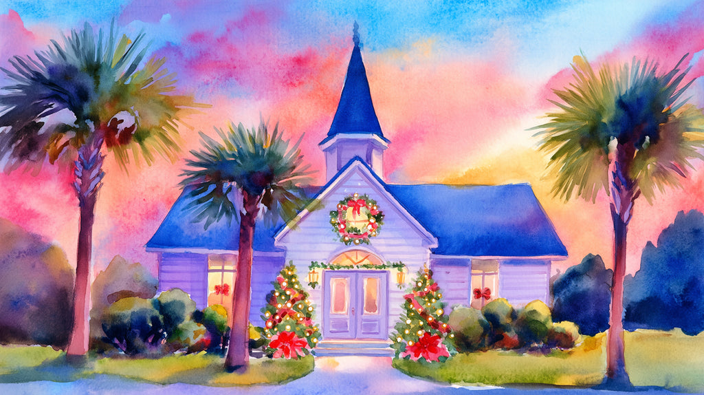 The Tropical Christmas Church Watercolor Mural Wallpaper captures a unique coastal holiday scene. A white church, decorated with Christmas trees and wreaths, is flanked by lush palm trees. The background is a vibrant, expressive watercolor sky blending intense pinks, oranges, and blues, suggesting a tropical sunset or sunrise. The soft, painterly aesthetic conveys a cheerful, warm, and distinctly non-traditional holiday feel. This mural is ideal for a Florida room, a beach house, or a entryway seeking a bright, airy, and unexpected Christmas theme.