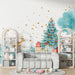 The Turquoise Watercolor Christmas Scene Mural Wallpaper is a bright, artistic, and whimsical holiday scene. A snow-dusted Christmas tree laden with red and gold gifts stands centrally, flanked by a stylized deer and abstract trees, all rendered in a light, expressive watercolor style dominated by vibrant turquoise, teal, and soft white. Gold splatter and star motifs add a magical, sparkling touch. This mural is ideal for a kid’s room, a brightly nursery, or a modern space with a soft, artistic, and light-hearted holiday theme.