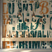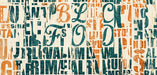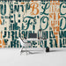 An edgy and modern wall mural featuring a collage of distressed typography. Large, fragmented letters and words in teal, orange, and cream overlap to create a textured, grunge look reminiscent of torn street posters or vintage printing blocks.