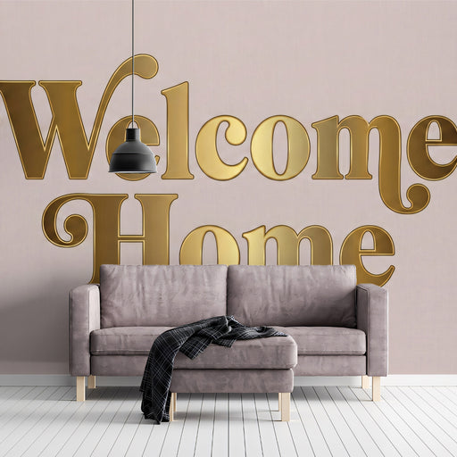 Vivawalls StoreThe Elegant Gold Typography Welcome Home Wall Mural features beautifully crafted, dimensional gold lettering set against a smooth, warm pastel back...