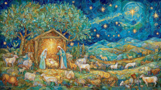 VIVAWALLSThe Mosaic Nativity and Starry Night Mural Wallpaper is a vibrant and highly textural artwork, resembling an intricate mosaic or stained-glass pain...