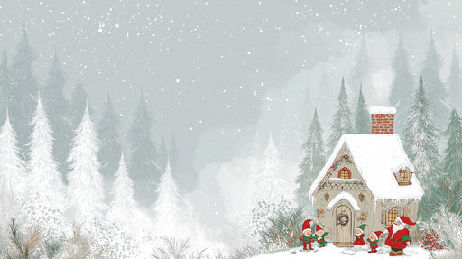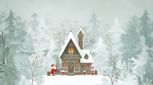 詳細を全部見るSnowy Cabin and Elves Illustration Mural Wallpaper | Forest Foreground, Mint Green Tones, Wide Vista