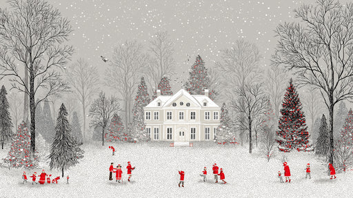 詳細を全部見るGrayscale Winter Mansion Mural Wallpaper | Monochromatic Forest, Red Figure Accents, Graphic Charm
