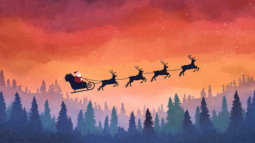 VIVAWALLSThe Arctic Twilight Sleigh Ride Mural Wallpaper is a picturesque, stylized winter scene. Santa's sleigh and reindeer are dark silhouettes against a...