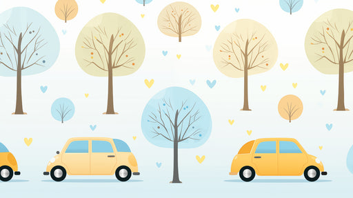 VIVAWALLSThe Minimalist Car & Tree Landscape is a cheerful and simple repeating design. It features a bright yellow cartoon car driving past stylized tr...