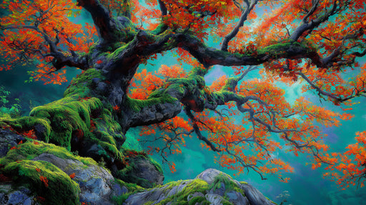 VIVAWALLSImmerse yourself in the breathtaking colors of autumn with this captivating wallpaper, featuring a magnificent ancient tree with a thick, moss-cove...