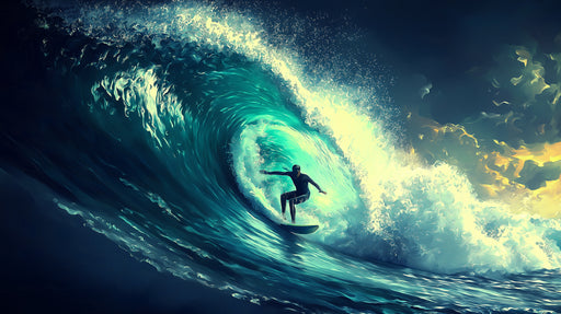 詳細を全部見るSurfer in Blue and Yellow Barrel Mural Wallpaper | Impasto Texture, Dynamic Sunset Light, Cool/Warm Contrast