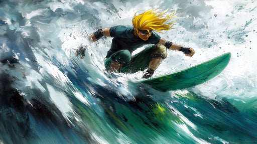 詳細を全部見るAnime-Style Surfer Action Mural Wallpaper | Dynamic Brushwork, Vibrant Green Board, High Energy