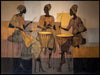 Celebrate cultural heritage with this stylized African mural. Using geometric patterns and bold outlines, the design depicts three drummers in rhythmic celebration against a textured earth-toned background. This ethnic art wallpaper adds energy and a sophisticated narrative to a modern commercial space or an artistic lounge.
