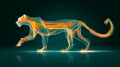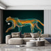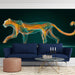 The Abstract Fire Cat Spirit Mural Wallpaper is an ethereal and unique piece of art. It depicts a large feline predator (likely a jaguar or cheetah) composed entirely of swirling, luminous lines in vibrant orange, yellow, and electric teal. The animal is captured mid-stride against a deep, dark teal background, giving the impression of a glowing, elemental spirit or energy form. The fluid lines create a strong sense of internal movement and mystery. This mural is ideal for a living room, a cutting-edge modern office, or any room seeking a mesmerizing, abstract focus.