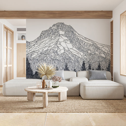 Black and White Line Art Mountain Peaks Mural Wallpaper | Dramatic Landscape Sketch