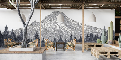 The Black and White Line Art Mountain Peaks Mural Wallpaper depicts majestic mountain peaks using high-contrast white lines on a black background. The detailed linework emphasizes the rugged texture and steep slopes of the mountains, creating a dramatic and modern visual. This mural is ideal for a feature wall in a contemporary dining room, office, or study.