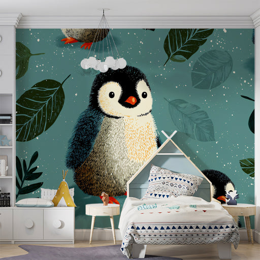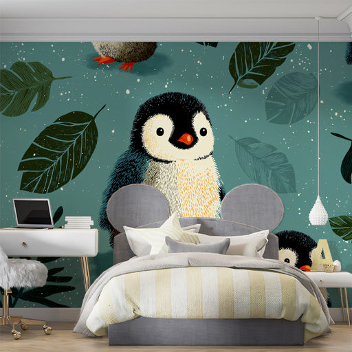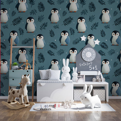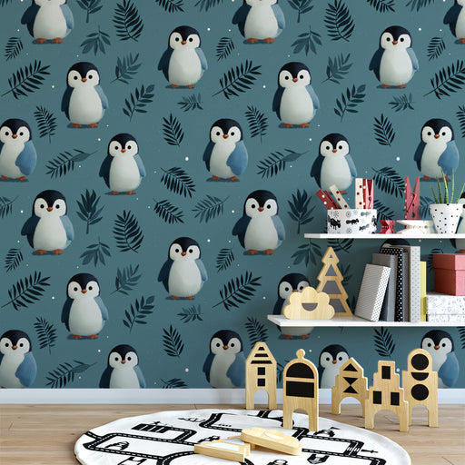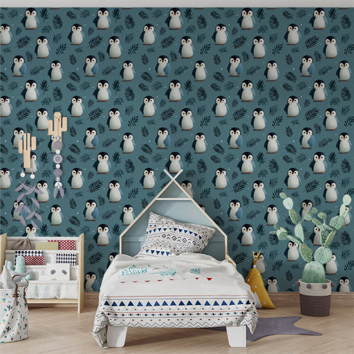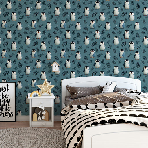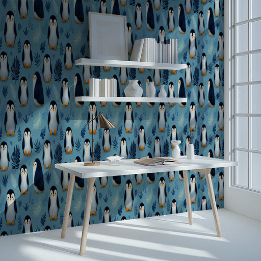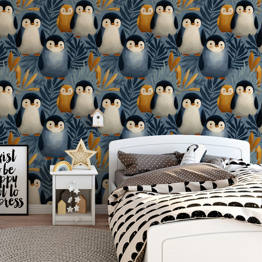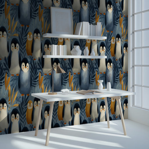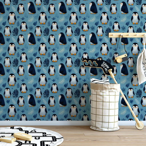 Pair this vibrant wallpaper with simple, modern furniture in white or light wood to make the pattern the hero of the room. Use pops of warm colors, like orange or yellow, in accessories to complement the penguins' beaks and add a touch of fun.