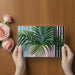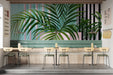 The Chic Geometric Tropical Palm Mural Wallpaper is a bold and fashion-forward artwork. It features green palm leaves emerging from a stylized pink box, set against a background of high-contrast blue, black, and white stripes. The playful use of geometric shapes and vibrant colors creates a modern pop-art energy. This mural is ideal for a trendy entryway, a restaurant, or a creative home studio.