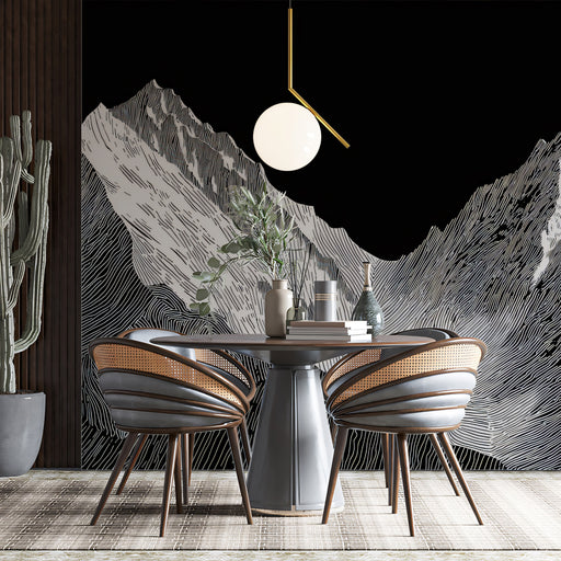 TIPS: Use substantial furniture to balance the dramatic scale of the landscape. Incorporate natural stone elements and cool blues/greys in the decor to harmonize with the mural.