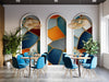 The Colorful Abstract Mosaic Stone Texture Mural Wallpaper features an irregular mosaic pattern of stone-like shapes in vibrant colors such as blue, orange, red, and grey, separated by gold lines. The textured appearance and bold colors create a dynamic and modern look. This mural is perfect for adding a pop of color and texture to a living room, bar, or creative space.
