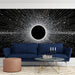 The Concentric Light Burst Black Hole Mural is a dynamic and abstract visualization of a black hole's energy. A central black circle is surrounded by a dense field of white light and dots that radiate outward along linear paths, suggesting data points or particles accelerating from the center. The pattern is highly rhythmic and geometric, creating a powerful sense of force and speed. This high-contrast, digital-style mural is ideal for a media room, a tech-focused study, or a contemporary space seeking an energetic, abstract focal point.
