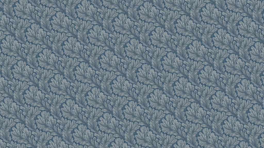 The Diagonal Fern Frond Wallpaper is a sophisticated and dense textural pattern. It features a small-scale, high-density repetition of feathery fern fronds set in a strong diagonal grid on a deep dusty blue background. The slight variations in the blue-gray tone of the fronds create an illusion of depth and movement, resembling a finely woven fabric. This is an excellent choice for a dining room, a feature wall, or a commercial space that requires a rich, structured textural background.