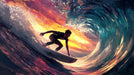 Dramatic Sunset Barrel Wave Surfing Mural Wallpaper | Fiery Sky, Silhouetted Surfer, Intense Ocean Colors