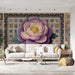 Eclectic Ornate Peony & Tile Mural Wallpaper | Large Purple Bloom, Detailed Traditional Motif Backdrop