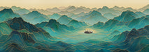 Sweeping, fluid lines in shades of teal form an ethereal landscape in this wall mural. The gold-accented boat drifting through the currents creates a peaceful, meditative atmosphere, blending modern abstract flow with traditional landscape themes.