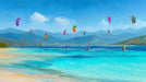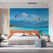 Extreme Kite Surfing Beach Mural Wallpaper | Impressionist Style, Bright Aqua Water, Mountain Horizon