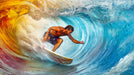 Fiery Barrel Wave Surfing Mural Wallpaper | Elemental Contrast, Dynamic Ocean Action, Bright Colors