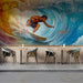 The Fiery Barrel Wave Surfing Mural Wallpaper is an intensely vibrant and dynamic artwork. It captures a surfer riding within the barrel of a massive wave, where the water on one side glows with a fiery yellow and orange, while the other side remains a vivid blue. This extreme color contrast emphasizes the raw power and elemental forces at play, creating a thrilling and visually arresting scene. This mural is ideal for a cafe, a living room, or any area seeking a bold and vibrant focal point.