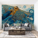 The Filigree Teal and Gold Octopus Mural Wallpaper is an opulent, artistic, and detailed artwork. It features a close-up of a teal octopus, with its skin covered in a dense and delicate golden lace or filigree pattern. The warm, glowing gold lines contrast beautifully against the cool blue tones, creating a high-end, contemporary aesthetic. This mural is ideal for a statement wall in a dining room, a luxurious living room, or a modern office.