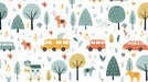 The Folk Art Safari Car Pattern is a charming and earthy design. The repeating motif features a stylized blend of safari animals (deer, cow, sheep) and retro-inspired cars (school bus, sedan) interspersed with abstract trees and foliage. The palette of muted orange, mustard yellow, and dusty teal is reminiscent of folk art or Scandinavian design. This mural is ideal for a contemporary nursery, a playroom, or a bedroom with a rustic touch.