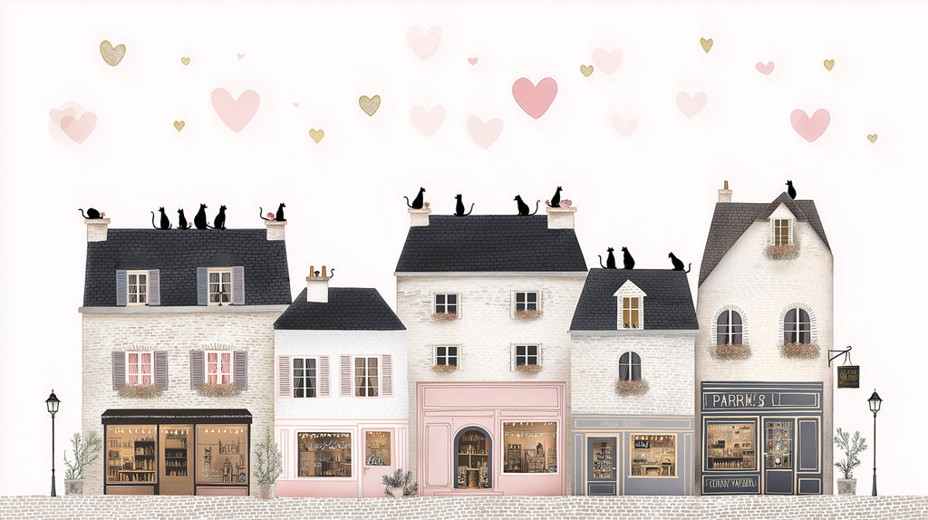 The French Boutique Row Mural Wallpaper is a crisp and charming piece of art. It features a row of highly detailed, stylized French storefronts in a clean, mostly black, white, and gray palette, subtly accented by blush pink trim. A playful gathering of black cat silhouettes adds a quirky charm to the dark rooftops, while soft pink and gold hearts drift in the bright white sky, introducing a touch of romantic fantasy. The high contrast and defined architectural lines create a sense of classic Parisian sophistication. This mural is perfect for a chic bedroom, a refined dressing area, or a stylish nursery.