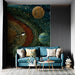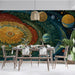 The Galactic Flower Mandala Mural Wallpaper is a highly unique and textural interpretation of a star system. The core is stylized as a massive, intricate flower or sun mandala in warm gold, orange, and red, surrounded by spiraling arms of dark teal and rich green threads. Multiple planets, also rendered with swirling, hand-drawn textures, orbit the central figure. The overall style is maximalist, highly detailed, and blends abstract, almost folk-art design with astronomical themes. This mural is a powerful statement piece for a dining room, a bold living room, or a space valuing hand-crafted aesthetics.