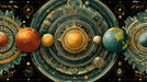 The Geocentric Cosmic Map Mural Wallpaper is a richly detailed, mythological representation of the cosmos, centered on a stylized sun or star. Planets (including a recognizable Earth) are placed within a dense, symmetrical framework of elaborate, ancient-looking mechanical rings and symbols. The dominant colors are deep teal/green and warm gold/ochre, creating a sophisticated, vintage, and profound aesthetic. The image suggests a fusion of ancient astronomy, steampunk mechanics, and mythological world-building. This mural is ideal for a entryway, a bedroom, or a space with a classic, adventurous theme.