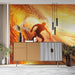 The Golden Sunset Barrel Surfer Silhouette Mural is an intensely dramatic, photo-realistic scene. A surfer is perfectly silhouetted inside the tube of a massive wave, which is entirely bathed in the fiery, warm light of a sunset or sunburst. The wave's surface glows like liquid gold, contrasting sharply with the dark figure. The image conveys pure, exhilarating energy and monumental scale. This mural is ideal for a entryway, a luxury lounge, or a space where maximum visual impact and warmth are desired.