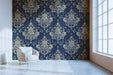 Grand Navy Blue Damask Wallpaper, Ornate Symmetrical Mural, Luxury Victorian Wall Decor, Custom Size Premium Peel and Stick Fabric