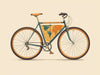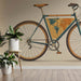 The Graphic Bicycle with Map Frame Mural Wallpaper is a contemporary take on retro travel art. The illustration of a sleek road bicycle features a unique detail: the central frame triangle is filled with a portion of an antique world map, creating a map-within-a-frame effect. The color palette uses a striking contrast of deep teal-blue for the frame and warm orange/tan for the wheels and map detail, set against a simple cream background. This design is clean, graphic, and subtly intellectual. It suits a modern office, a stylish youth room, or a contemporary entryway.