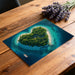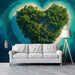 The Heart-Shaped Island Aerial View Mural Wallpaper is a charming and romantic artwork. It features a lush, green heart-shaped island surrounded by vibrant turquoise waters, contrasting beautifully with the deep blue of the open ocean. A small white boat gently floats nearby, adding a touch of serene detail. The overhead perspective emphasizes the island's unique shape and the clarity of the tropical waters. This mural is ideal for a romantic office, a serene entryway, or a space that celebrates love and natural beauty.