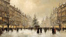 Impressionist Snowy Cityscape Mural Wallpaper | Vintage Oil Painting, Busy Market Scene, Warm Sepia Tones