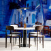 The Intense Blue Greek Alley Mural Wallpaper is a dramatic and atmospheric artwork. Dominated by deep, cool shades of blue and indigo, the scene captures a steep, narrow alleyway in a Greek island town at night. The traditionally white buildings are saturated with blue tones, contrasting sharply with the warm red-brown chairs and the subtle golden light emanating from the windows. The visible, textured brushstrokes and the strong shadows on the cobblestone street create a compelling sense of depth and mystery. This mural is perfect for a stylish dining room, a corridor, or a modern living room seeking a moody, high-fashion statement.