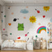 The Kawaii Cat & Rainbow Pattern is a simple, high-impact design. The sparse, all-over motif features minimalist line-drawn cat faces, happy suns, small rainbows, and hearts in a bright, high-contrast palette of green, pink, red, and blue against a clean white background. The hand-drawn aesthetic is charming and highly cheerful. This mural is ideal for a young child's room or a colorful accent wall.
