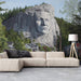 Blending nature with human artistry, this mural showcases a colossal portrait carved into a cliff, watching over a peaceful residential street. The lush green forest and realistic architectural details create a unique surrealist landscape. This wallpaper is perfect for creating a sense of wonder in a modern hallway or living area.