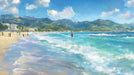 The Mediterranean Beach Windsurfing Mural Wallpaper is a bright, energetic, and serene artwork. It captures a wide coastal view of a turquoise sea with windsurfers and gentle waves breaking on a tan beach, backed by lush, rolling hills and a small town. The visible, expressive brushstrokes and the bright, clear colors create a lively, sun-drenched, and tranquil atmosphere, characteristic of the Mediterranean. This mural is ideal for a cafe, a sunroom, or a space celebrating coastal life and water sports.