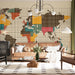 The Mid-Century Grid World Map Mural Wallpaper is a clean, nostalgic, and sophisticated artwork. The continents are simplified into large, distinct blocks of retro color—mustard yellow, teal, dusty pink, and dark brown—overlaid on a subtle, faded Cartesian grid. The overall aesthetic is minimalist, graphic, and evokes the clean design principles of the mid-20th century. This mural is ideal for a modern office, a den, or a minimalist living space with a retro-chic touch.