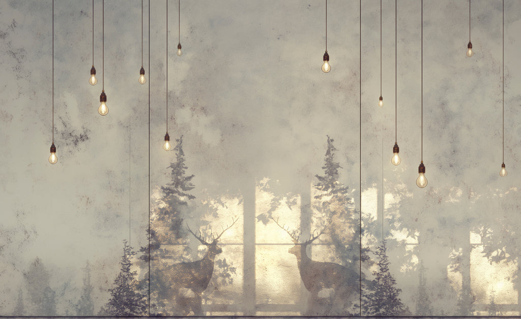 This wallpaper features a minimalist design with a deer silhouette and a few hanging light bulbs against a beige background with brown and white accents. The simplicity of the design creates a clean and modern look, while the deer and light bulbs add a touch of interest and charm. The overall effect is calm and uncluttered, making it suitable for a space where a minimalist aesthetic is desired.