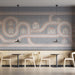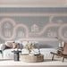 The Minimalist Road Map & Houses Mural is a sophisticated, interactive design. It features wide, winding road tracks perfect for toy cars, interspersed with simple, line-drawn houses. The entire design is set against a monochromatic gray fabric texture (canvas/hessian print), with the roads highlighted in pale pink and white. This mural is ideal for a cafe or living room, serving as both decoration and a play surface.