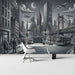 A dynamic monochrome wall mural depicting a bustling modern city. The detailed line drawing features skyscrapers, bridges, trains, buses, and pedestrians, capturing the energy of urban life in a stylish greyscale palette. It resembles a sophisticated comic book or architectural sketch.