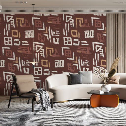 The Modern Tribal Mural Wallpaper is a versatile and artistic piece of art. Its design features a small-scale, repeating pattern of abstract, hand-drawn geometric lines in a soft off-white, all set against a warm, earthy brown background. The intricate pattern adds a sense of subtle artistry and charming detail without overwhelming the senses. This mural is an ideal choice for a serene bedroom, a peaceful reading nook, or a minimalist living room that seeks a touch of tranquil elegance.