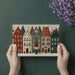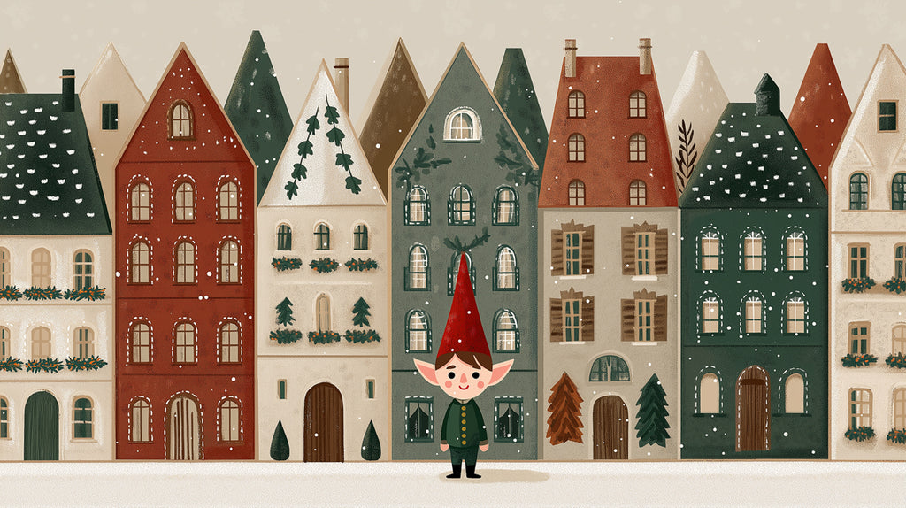 The Nordic Row House and Elf Mural Wallpaper features a linear display of stylized, snow-dusted row houses in a muted palette of terracotta, moss green, cream, and deep red. A cheerful, oversized elf figure stands front and center. The design is simple, clean, and charming, reminiscent of Scandinavian folk art and minimalist illustration. The orderly arrangement and soft colors create a quiet, cozy, and sophisticated holiday scene. This mural is ideal for a hallway, a child's bedroom, or a modern space with a subtle, warm Christmas theme.