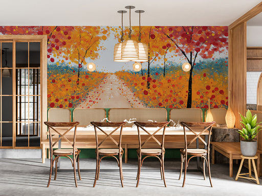 With a Warm Dynamism style, it fits living rooms aiming for a lively and warm aesthetic. The mural pairs well with contemporary furniture, warm lighting, and decorative elements like plants or art prints to enhance the warm and dynamic mood.